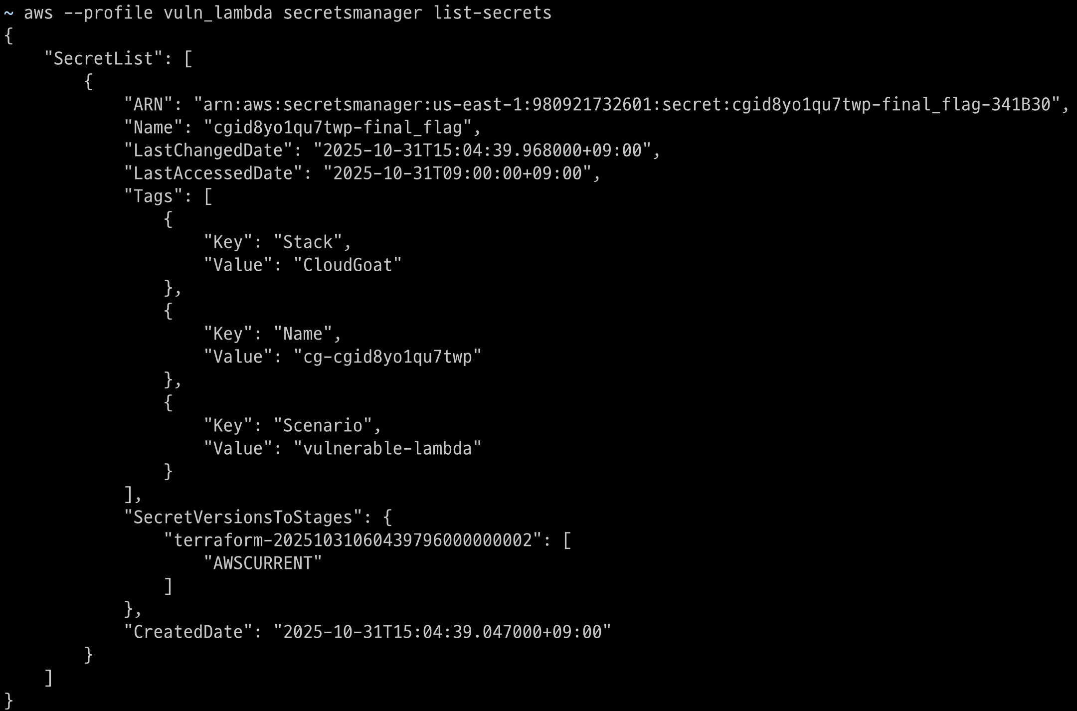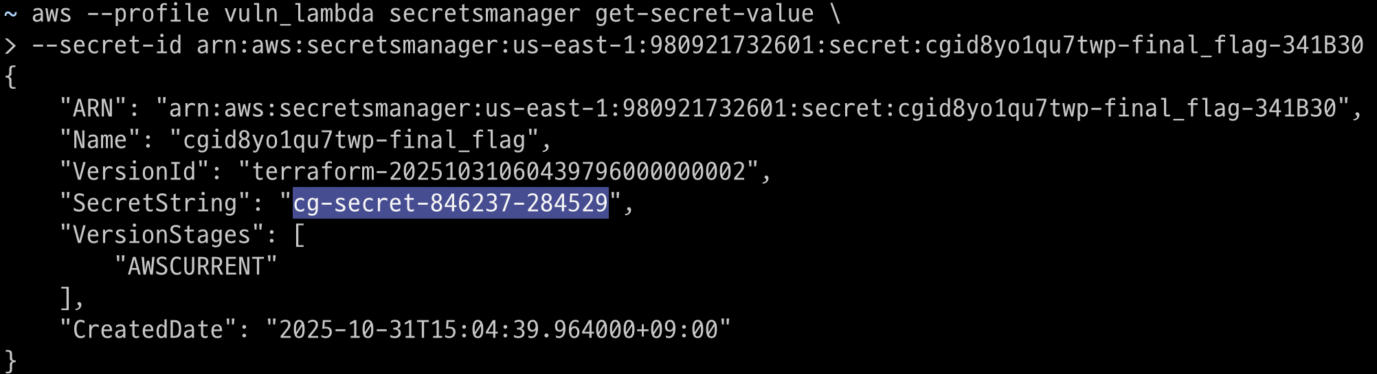 그 결과 cgid8yo1qu7twp-final_flag라는 이름의 Secret을 확인할 수 있었으며, get-secret-value 명령을 통해 해당 Secret의 값을 불러와