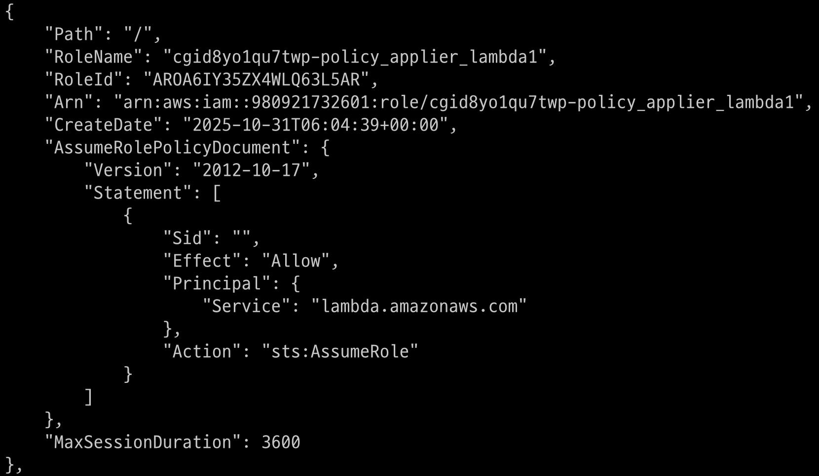 cgid8yo1qu7twp-policy_applier_lambda1는 처음 발견하는 역할로, Lambda라는 서비스가 Assume 할 수 있었다.
