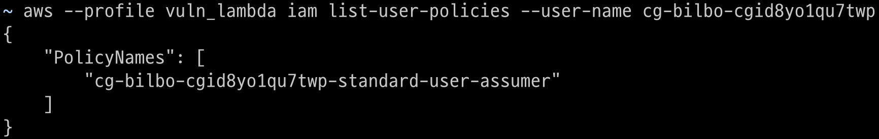 cg-bilbo-cgid8yo1qu7twp-standard-user-assumer라는 이름의 고객 관리형 정책을 발견할 수 있었다. 이제 해당 정책의 세부 권한을 확인하기 위해 get-user-policy 명령으로 JSON 구조를 확인했다.