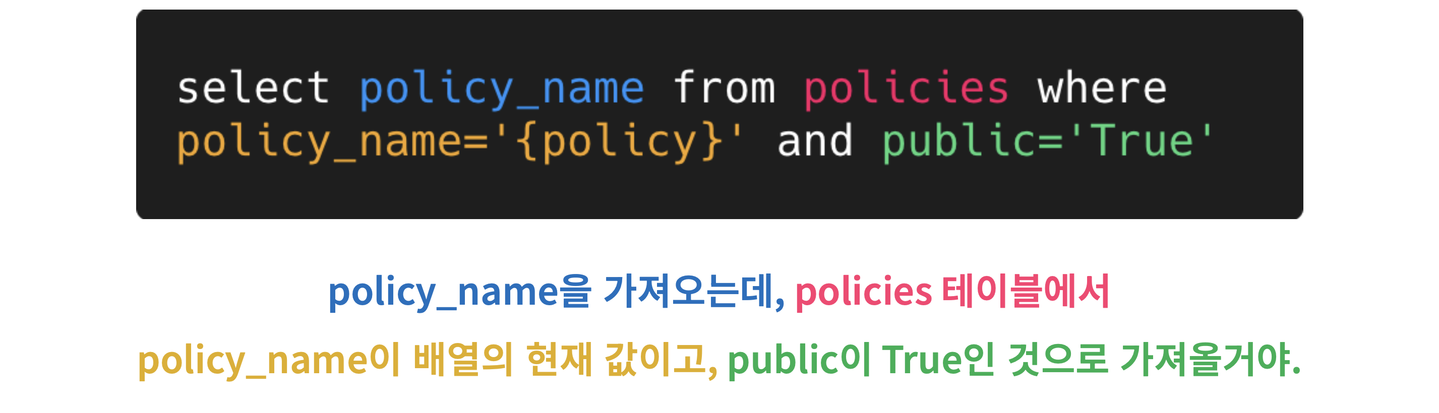 statement = f"select policy_name from policies where policy_name='{policy}' and public='True'" #statement 객체에 sql 구문 저장 -> db에서 현재 for문의 정책의 이름과 public은 true로 고정되어 있기에 public이 false인 값은 불러올 수 없음