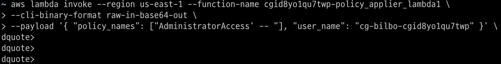 코드를 요약하자면 Lambda 함수 호출 시 전달되는 payload의 값으로 지정된 정책을 cg-bilbo-user에게 연결시키는 코드이다.