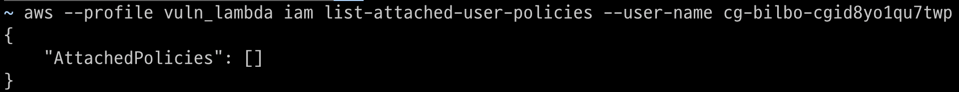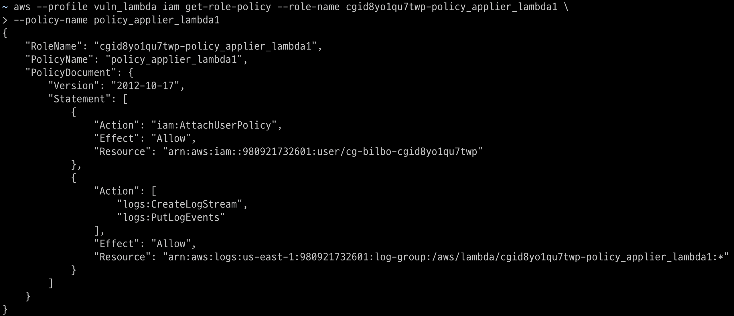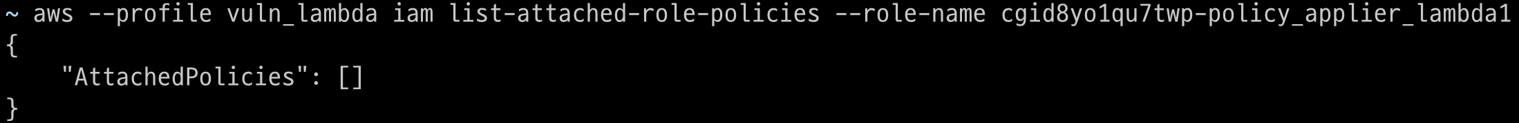 이번에는 Role 목록 조회를 통해 발견되었던 또 다른 역할인 cgid8yo1qu7twp-policy_applier_lambda1에 연결된 정책을 조회해 보았다. list-attached-role-policies 명령으로 연결된 관리형 정책은 존재하지 않음을 알게 되었고,