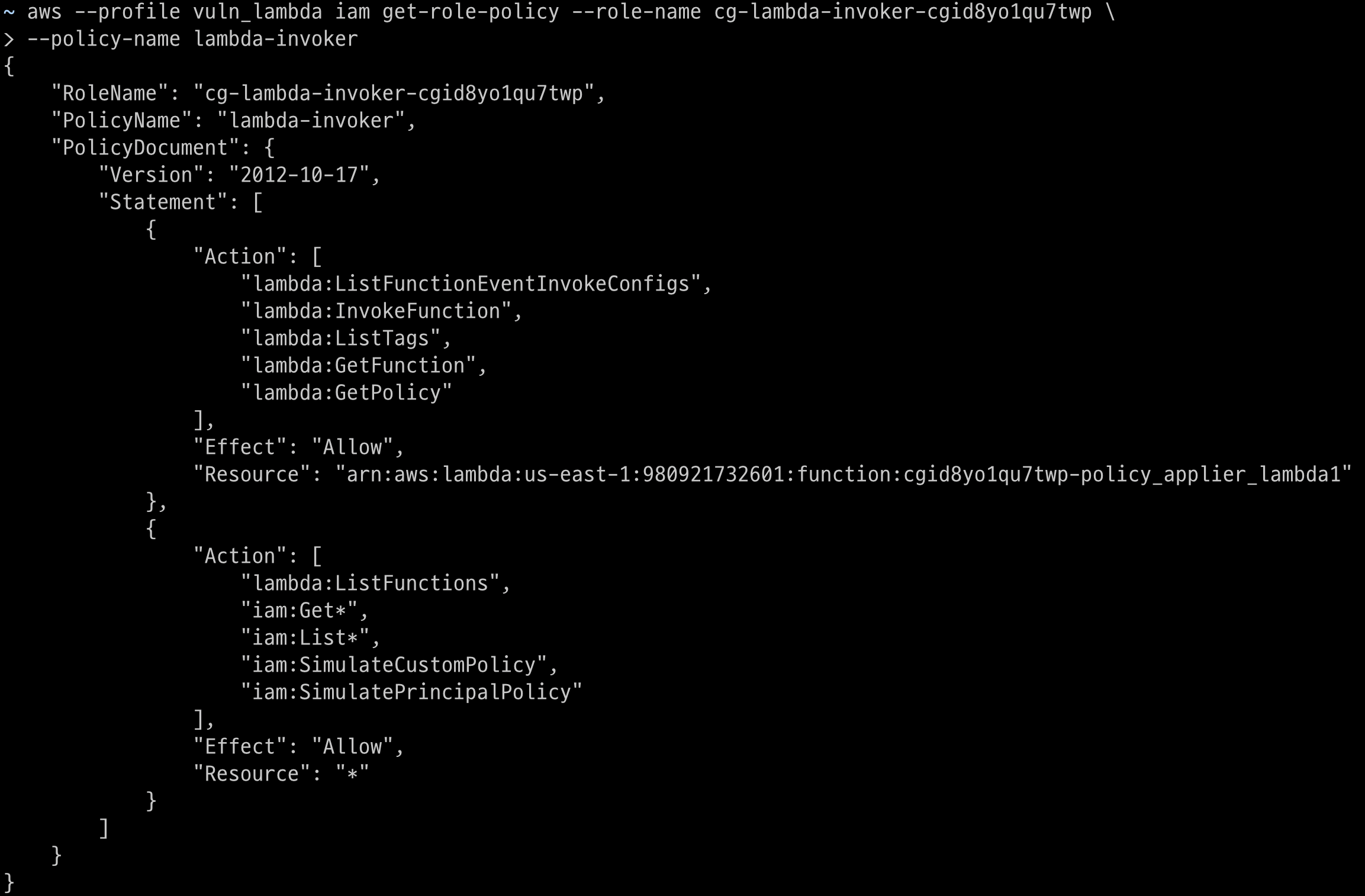 get-role-policy 명령을 통해 lambda-invoker 정책의 JSON 구조를 확인해 세부적인 권한을 조회했다.