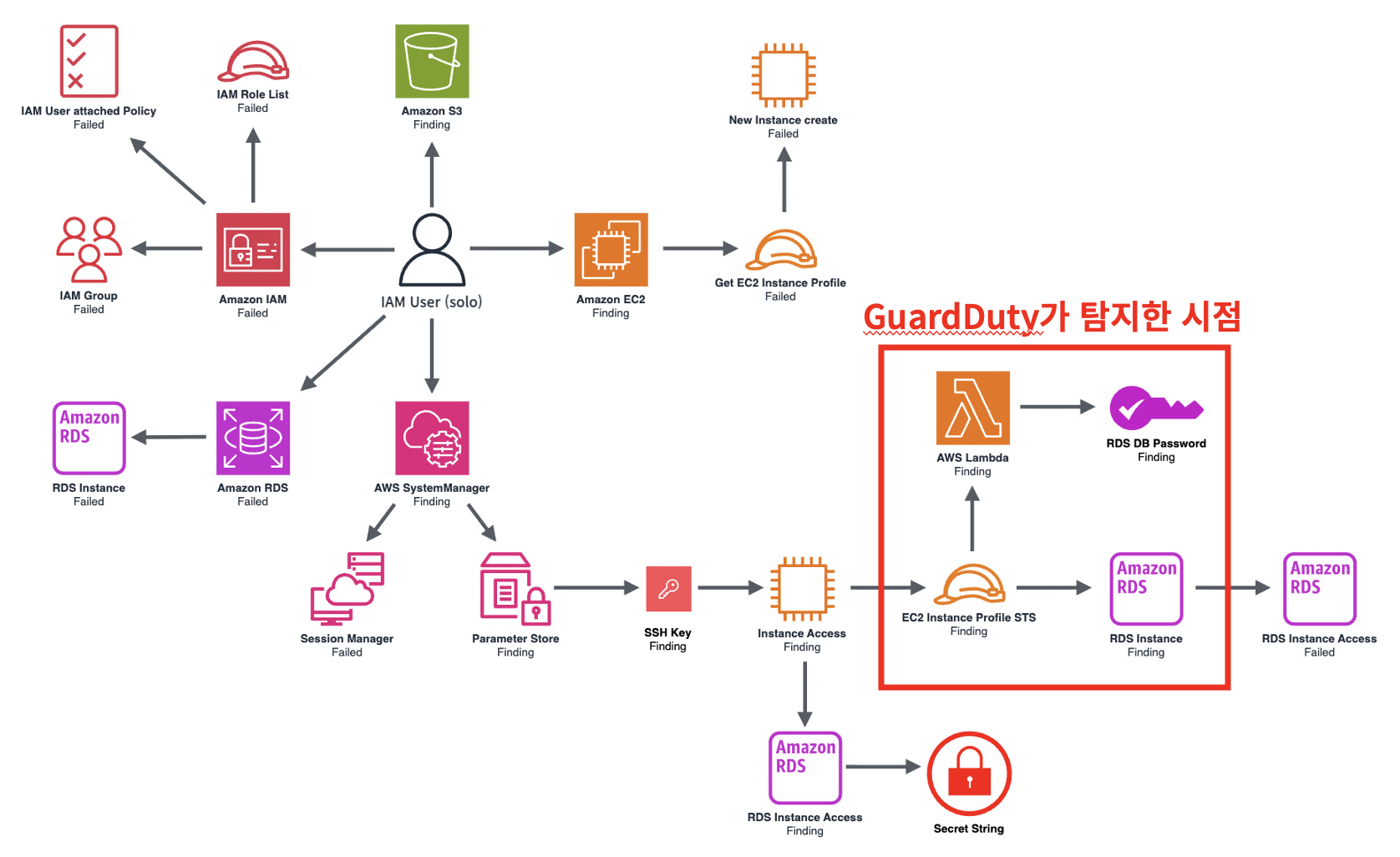 아래의 Graph는 제가 문제를 풀며 진행한 동작과 접근한 경로입니다. 그 중에서 GuardDuty가 탐지한 시점은 매우 일부임을 알 수 있고,