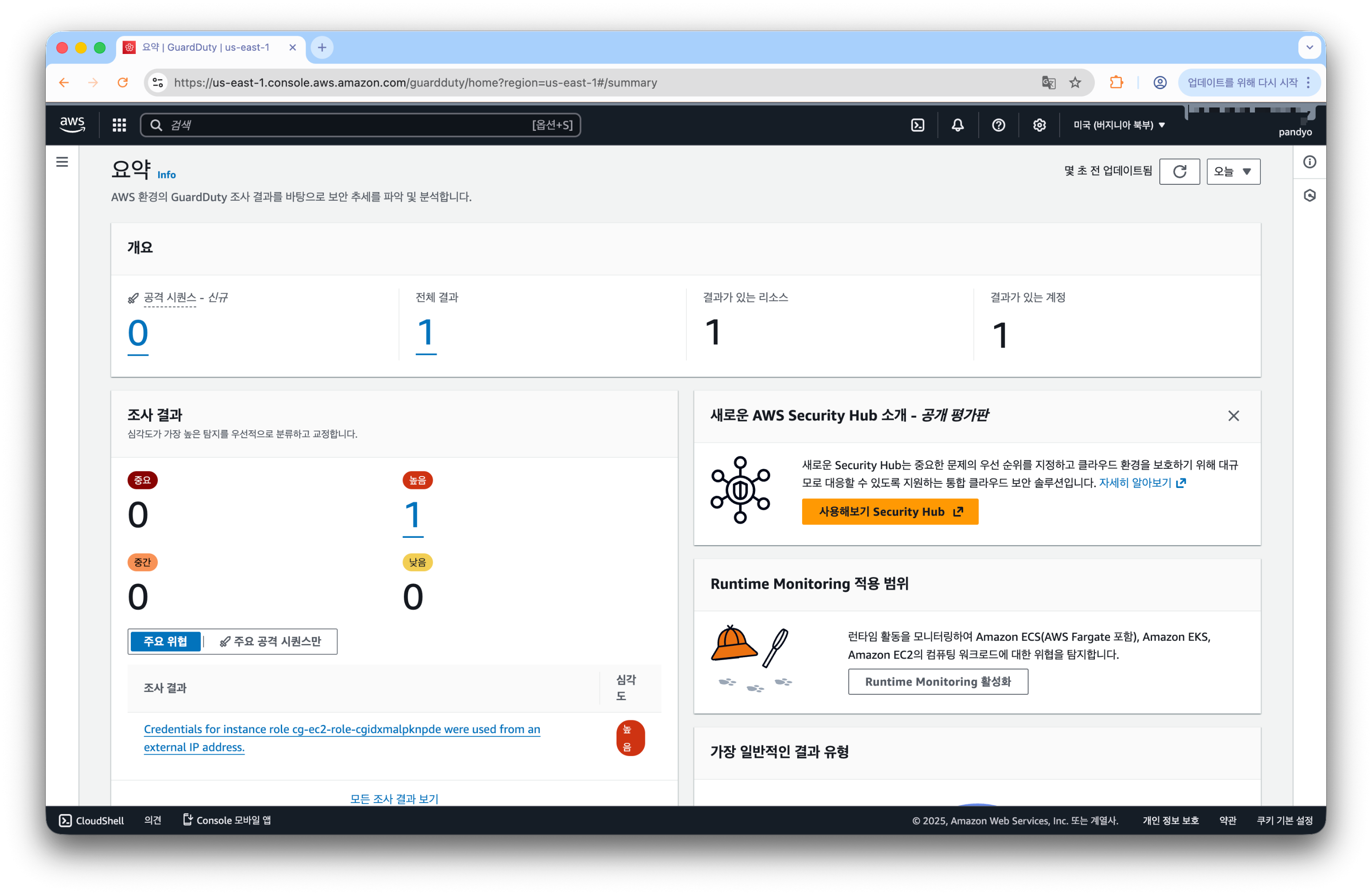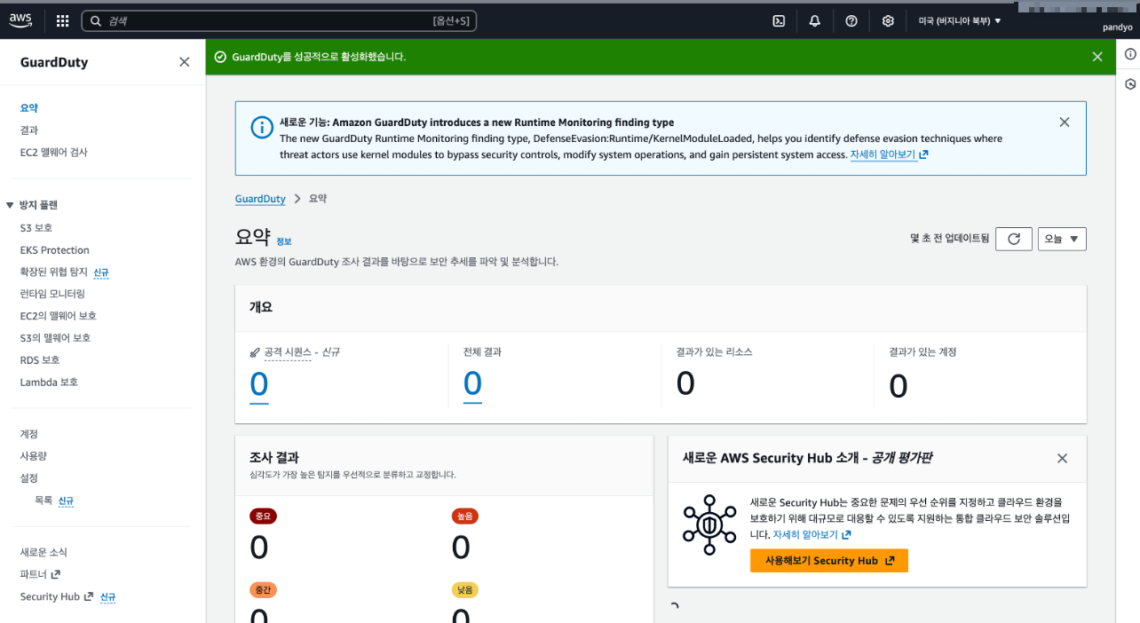 저는 실습이 진행될 미국 버지니아 북부(us-east-1) 리전에서 GuardDuty를 활성화 해주었습니다.
