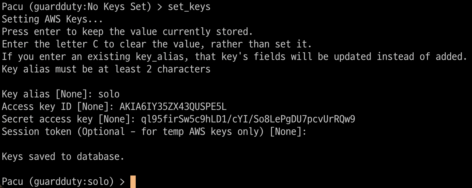 등록하는 키의 별칭, Access Key, Secret Key, Session token을 입력하면 키 저장이 끝난다. (Session token은 없으면 None 상태로 엔터를 눌러 넘어가주면 된다.)