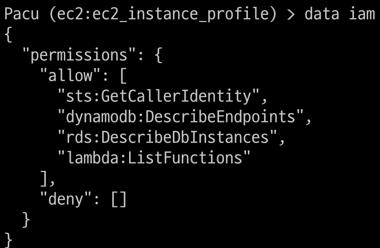 성공적으로 EC2 인스턴스 내부에 접근하였고, RDS에 접근할 수 있지만 접근에 필요한 비밀번호를 모르는 상태이다. 해당 EC2 내부에서 aws 명령을 이용해 EC2 인스턴스의 권한을 확인해보고 싶었지만 solo, calrissian와 마찬가지로 IAM 조회 권한이 존재하지 않아 이번에도 pacu를 활용하게 되었다.