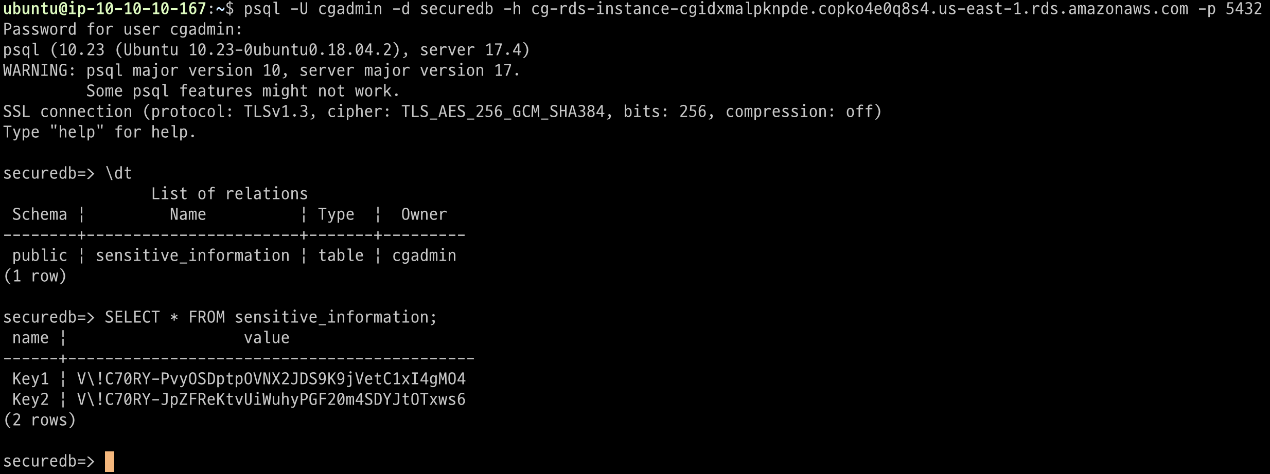 해당 정보를 이용해 EC2 인스턴스 내부에서 RDS 인스턴스에 접근할 수 있었고, postgreSQL에 저장된 값을 읽어올 수 있었다.