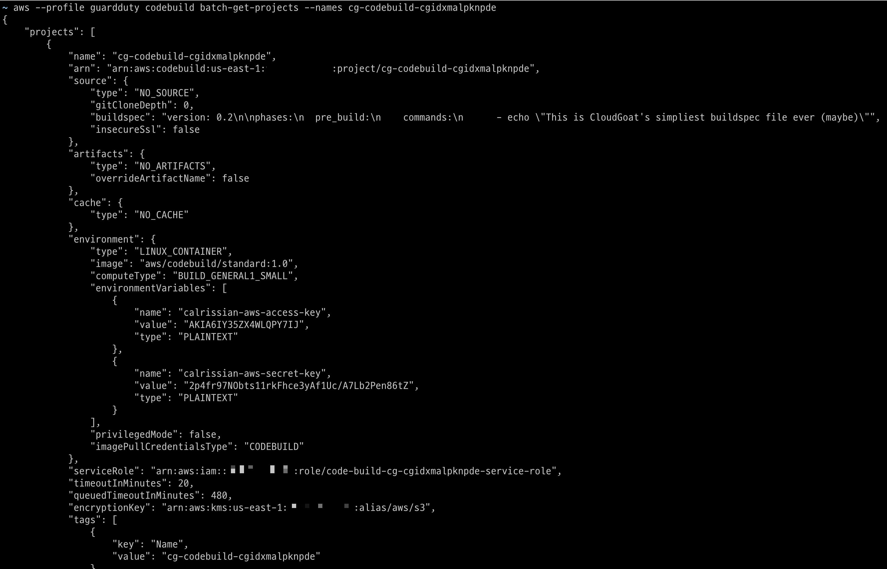 batch-get-projects 명령으로 해당 프로젝트의 세부 정보를 조회해보았고, 환경 변수 값으로 Access Key와 Secret Key가 노출되어 있는 것을 확인할 수 있었다.