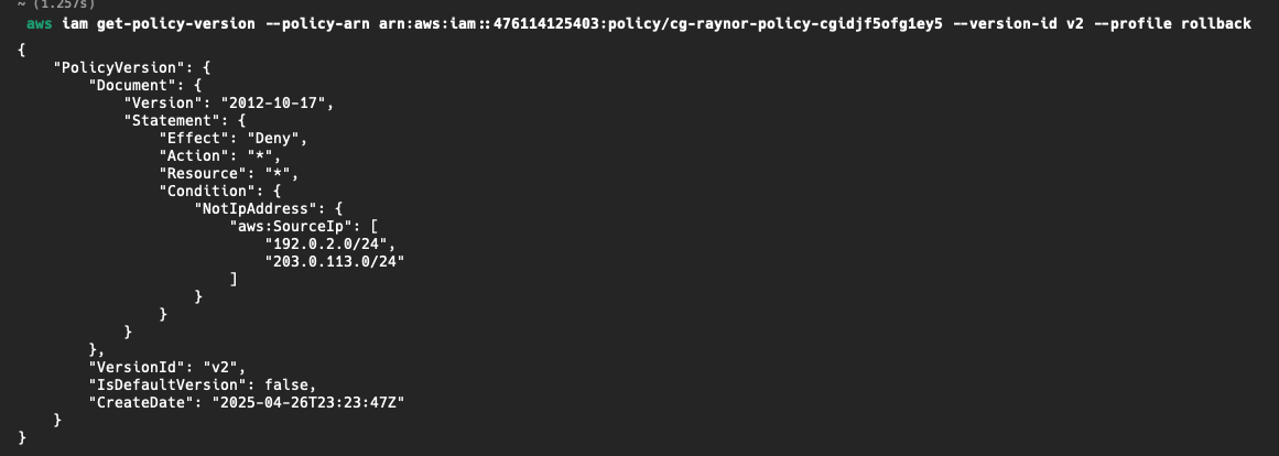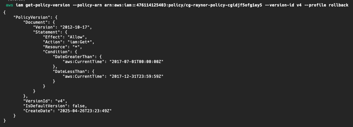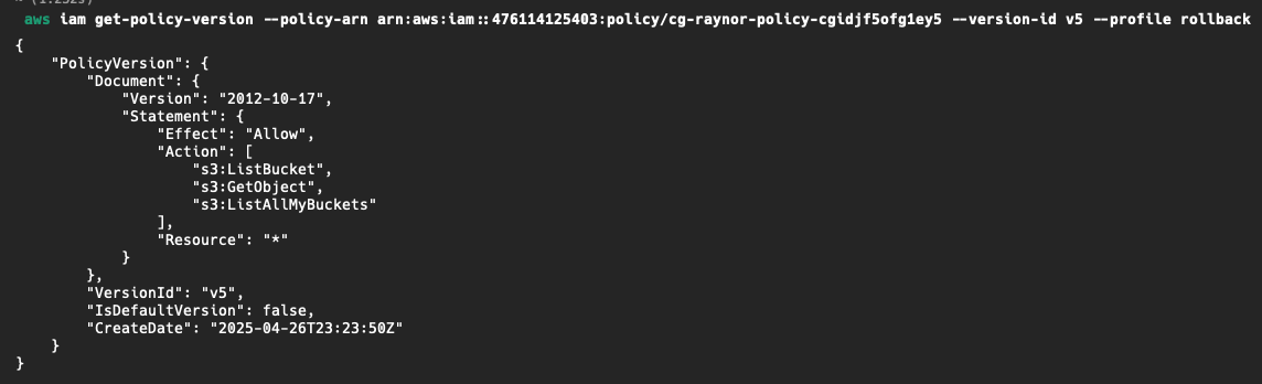 그럼 혹시, v1말고 다른 권한이 있는지 궁금해지지 않는가? 한번 찾아보자. 방법은 앞서 사용한 get-policy-version 명령의, version-id값을 변경해가면서 확인해보자.