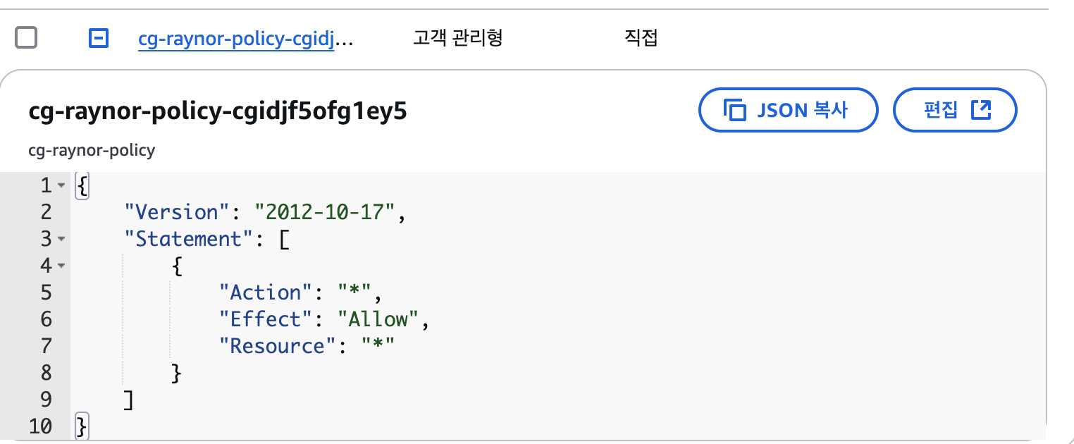 cg-raynor-policy라는 이름의 inline policy가 attached 되어있는 것을 확인해볼 수 있다.