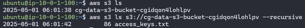 S3 전체 권한을 이용해 S3 버킷 종류를 조회하고 해당 버킷 내부를 확인해보니 access_keys.txt라는 문서가 존재하는 것을 확인할 수 있다.