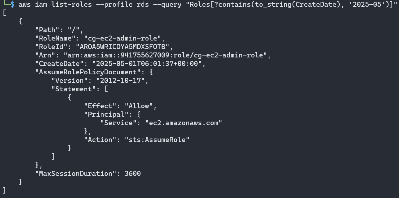 1. aws iam list-roles --profile rds 명령어로 role 확인 시, 기존에 확인했던 cg-ec2-admin-role 외에 다른 role은 無