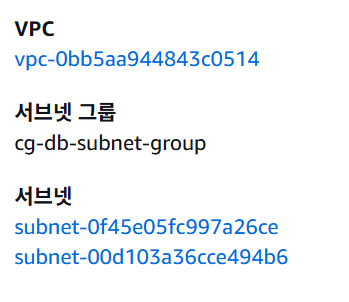 5. aws rds restore-db-instance-from-db-snapshot --db-instance-identifier {생성할 DB Identifier} --db-snapshot-identifier cg-rds-snapshot --db-subnet-group-name {기존 DB 서브넷 그룹} --vpc-secur